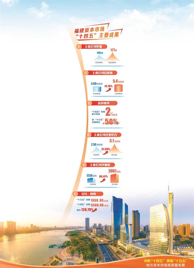 福建成本商场呈现出一系列亮眼的数字,以前五年平直融资累计糟蹋2万亿元,较“十三五”时间增长超五成,2025年A股IPO融资居寰宇首位;2025年末,全省上市公司总市值达5.4万亿元,排行寰宇第六,较“十三五”末增长74.76%,增速位列寰宇第四,市值增量达2.31万亿元。